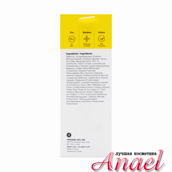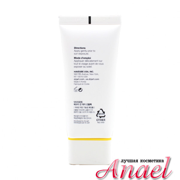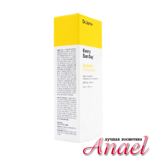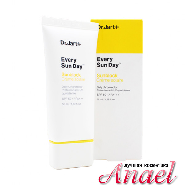 Солнцезащитный крем для лица и тела Dr. Jart+ Every Sun Day Sunblock SPF50+/PA+++, благодаря максимально натуральному составу, оберегает от вредного воздействия ультрафиолетового излучения, обладает плотной, тающей текстурой и быстро впитывается в кожу, не оставляя липкой или жирной пленки. Растительные экстракты в составе крема эффективно увлажняют кожу, и, являясь натуральными антиоксидантами, помогают выводить токсины и свободные радикалы, предохраняя кожу от фотостарения. Современный солнцезащитный комплекс физических и химических фильтров в составе крема защищает от широкого спектра излучений типов А и В, не нанося вреда коже.