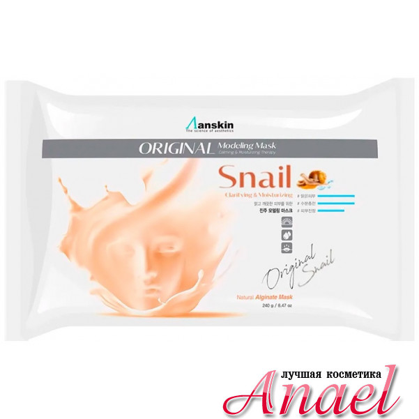Альгинатная маска Anskin Modeling Mask Snail Regeneration & Healing, благодаря фильтрату секреции улитки, экстракту корня лакрицы и гиалуроновой кислоте, интенсивно успокаивает, смягчает, восстанавливает и оздоравливает кожу. Диатомовая земля в основе маски состоит более чем на 80% из водного кремнезема (опала), который бережно отшелушивает ороговевший эпидермис, глубоко очищает поры и выравнивает общий рельеф кожи. Альгиновая кислота богата протеинами, минеральными веществами, аминокислотами и витаминами. Она питает и увлажняет кожу, обеспечивает подтягивающий эффект, активизирует процессы регенерации клеток, ускоряет выработку коллагена, сужает поры, устраняет раздражения и шелушения. Экстракт зеленого чая замедляет процессы хроностарения, помогая сохранить кожу красивой и здоровой значительно дольше, действует как мощный антиоксидант, предотвращая окисление клеток, которое приводит к возникновению кожных воспалений, образованию пигментации, появлению морщин. Аллантоин в составе маски обладает мягким отшелушивающим действием, эффективно предупреждает закупорку пор, образование комедонов и воспалений, стимулирует заживление кожного покрова, ран и шрамов, обладает антиоксидантной активностью, является эффективным противовозрастным компонентом.