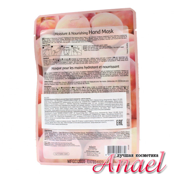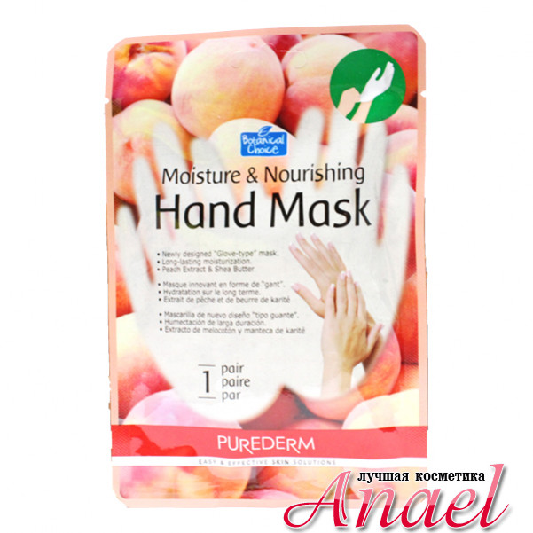 Увлажняющая питающая маска-перчатки для рук "Персик" Purederm Moisture & Nourishing Hand Mask, благодаря насыщенному составу пропитки, включающему масла ши и макадамии, экстракты персика, зеленого чая и меда, пантенол, мочевину, витамин E, эффективно смягчает, успокаивает, разглаживает, восстанавливает кожу рук. Маска устраняет шелушение и покраснение кожи, ускоряет заживление микроповреждений, насыщает необходимой влагой и питающими агентами, повышает упругость и эластичность кожи, тонизирует ее, оберегает от агрессивного влияния внешних факторов, придает бархатистую нежность и ухоженный вид.