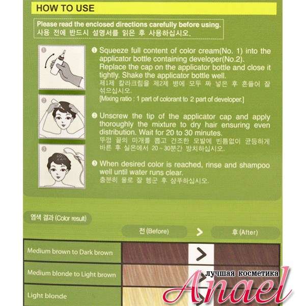 Краска покупалась маме, поэтому ставилась цель закрасить седину. Краску держали на волосах 20 минут. Цвет получился немного темнее ожидаемого, но сейчас лето — волосы выгорают быстрее, так что результат нас не расстроил. А так как маму красила я, то меня порадовал еще и запах краски, а точнее его отсутствие. Теперь помимо корейской косметики я буду покупать еще и корейскую краску для волос.