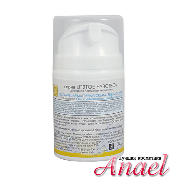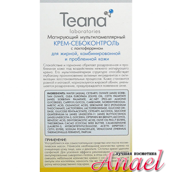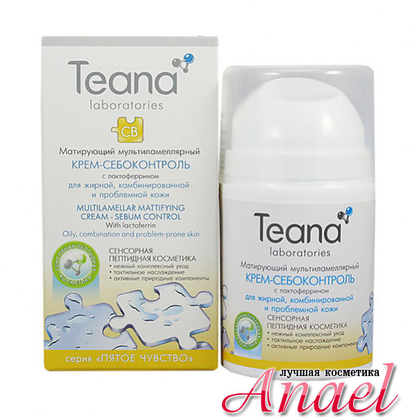 Матирующий мультиламеллярный крем-себоконтроль с лактоферрином Teana CB Multilamellar Mattifying Cream - Sebum Control из серии сенсорно-пептидной косметики "Пятое чувство" предназначен для жирной, комбинированной, проблемной, склонной к раздражениям кожи лица, обеспечивает ей спокойствие и гармонию. Благодаря мультиламеллярной структуре крема достигается глубокое проникновение активных ингредиентов и активизация восстановительных процессов. При регулярном использовании крема, кожа становится ровной и матовой, нормализуется жировой обмен, уменьшается раздражение, предупреждается появление акне.