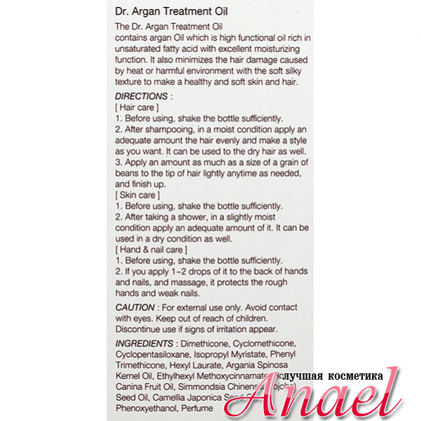 Восстанавливающее масло для волос и тела «Доктор Арган» The Skin House Dr. Argan Treatment Oil Hair & Skin Care насыщает клетки питательными и восстанавливающими агентами, придает упругость, эластичность, замедляет процессы старения, оберегает от негативного влияния внешних факторов. Масло устраняет повреждения в структуре волос, делает их более прочными, эластичными, гладкими, блестящими, возвращает насыщенность цвета, уменьшает расслаивание, нормализует обменные процессы, создает оболочку, препятствующую термическому повреждению. На кожу тела масло также влияет самым благотворным образом - делает ее мягкой, бархатисто-нежной, разглаживает морщинки, устраняет шелушения, раздражения, воспаления, сохраняет высокий уровень естественной увлажненности, стимулирует выработку собственных протеинов, улучшает липидную мантию кожи. Кроме того, масло укрепляет и увлажняет ногтевую пластину, улучшает рост ногтей, выравнивает их структуру, смягчает кутикулу, предупреждает появление заусенцев.
